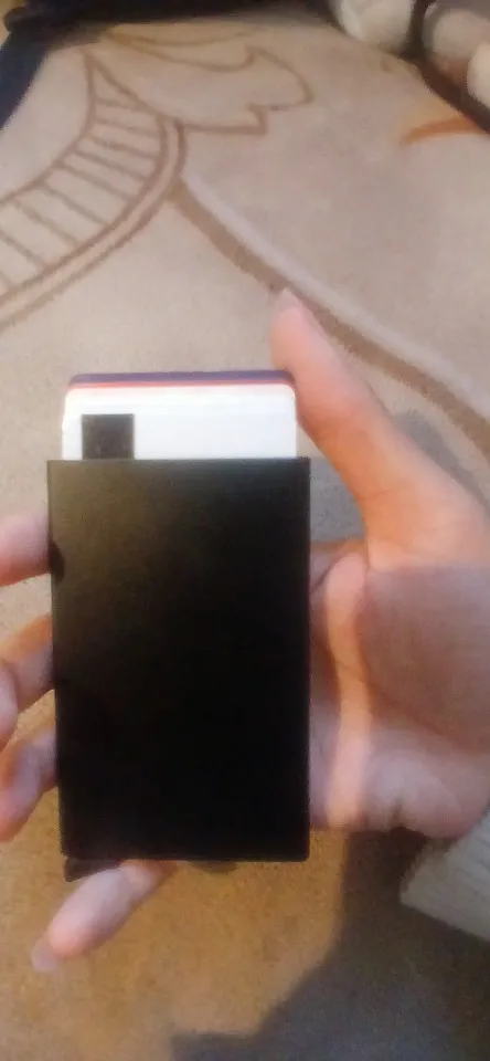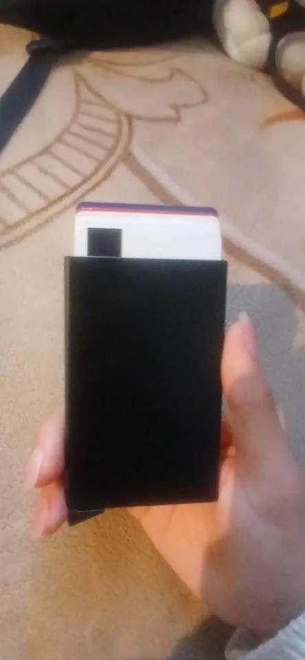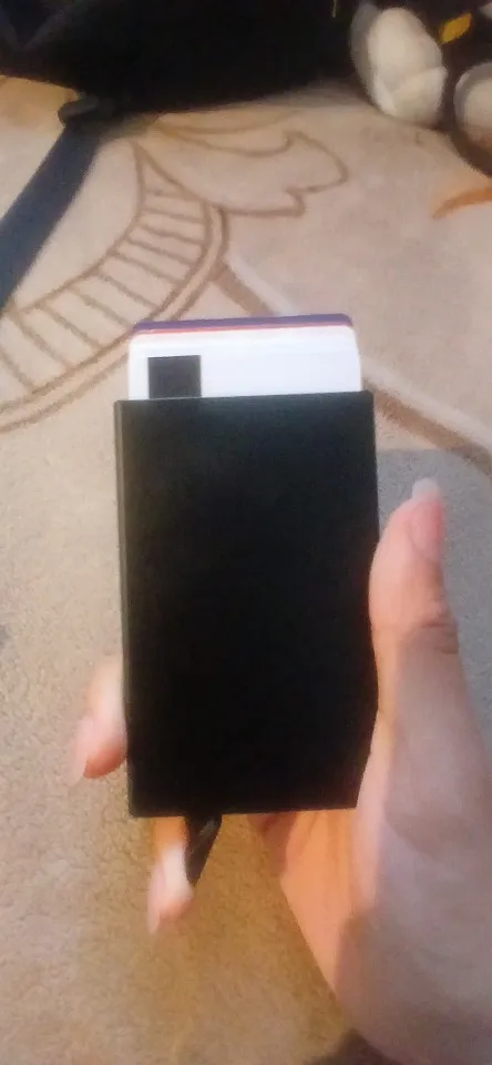 Designed as a compact everyday carry, this RFID card wallet combines a resilient metal shell with a minimalist interior. It shields your cards with RFID blocking technology and offers quick access through a slim pop-out slot, accommodating five to six cards in a sleek, pocket-friendly profile.
