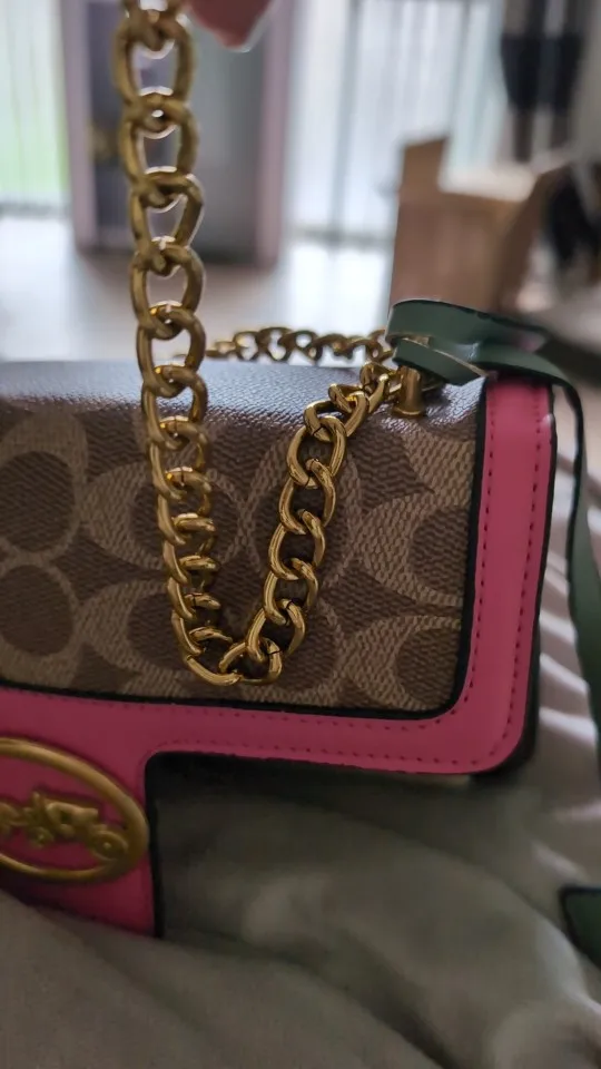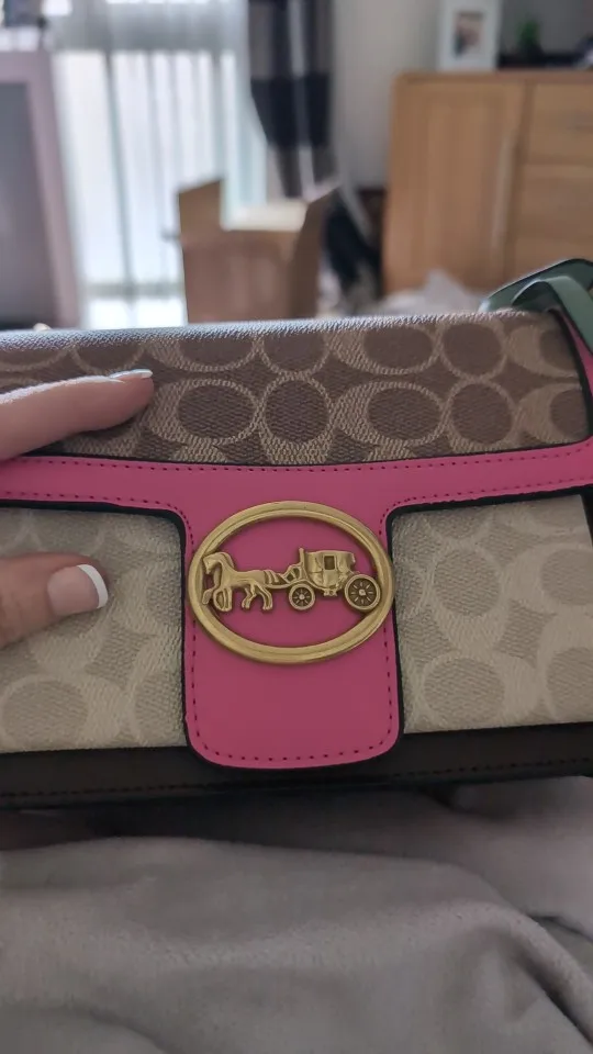- Hardware & Motif: Circular clasp with decorative carriage motif