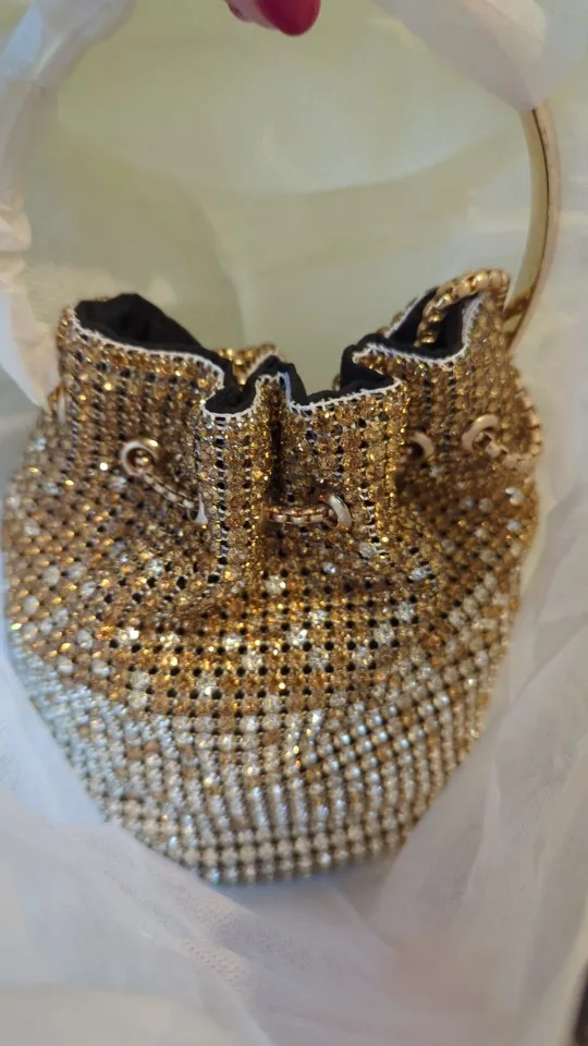 Designed as a dazzling evening essential, this bead-covered handbag blends sparkle with a refined silhouette. The bucket-type minaudière is adorned with rhinestones, beads, and embroidery, finished with a circular metal ring handle and a slender chain strap for hands-free wear. A secure hasp closure and a soft polyester lining safeguard valuables while keeping the silhouette compact and elegant. Perfect for prom, parties, or stage performances, it elevates any after-dark look.