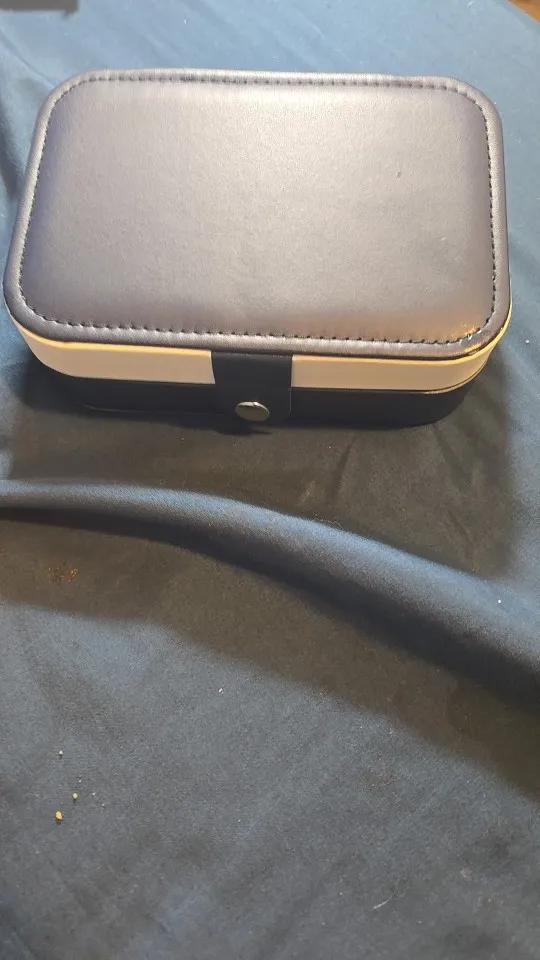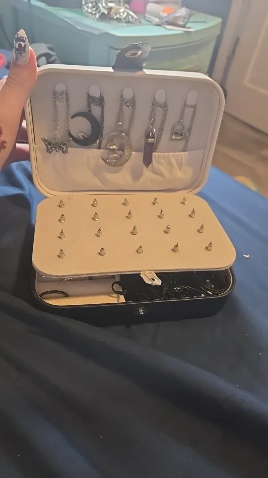 Designed as a portable jewelry storage box and travel organizer, this petite jewel box offers dedicated spaces for rings, earrings, necklaces, and bracelets. Crafted with a soft-touch exterior and cushioned interiors, it keeps pieces secure, organized, and ready for display. The lid doubles as a display panel with punched holes for earrings and a plush soft lining to protect delicate pieces. Compact size makes it ideal for travel or home storage while maintaining a refined aesthetic.