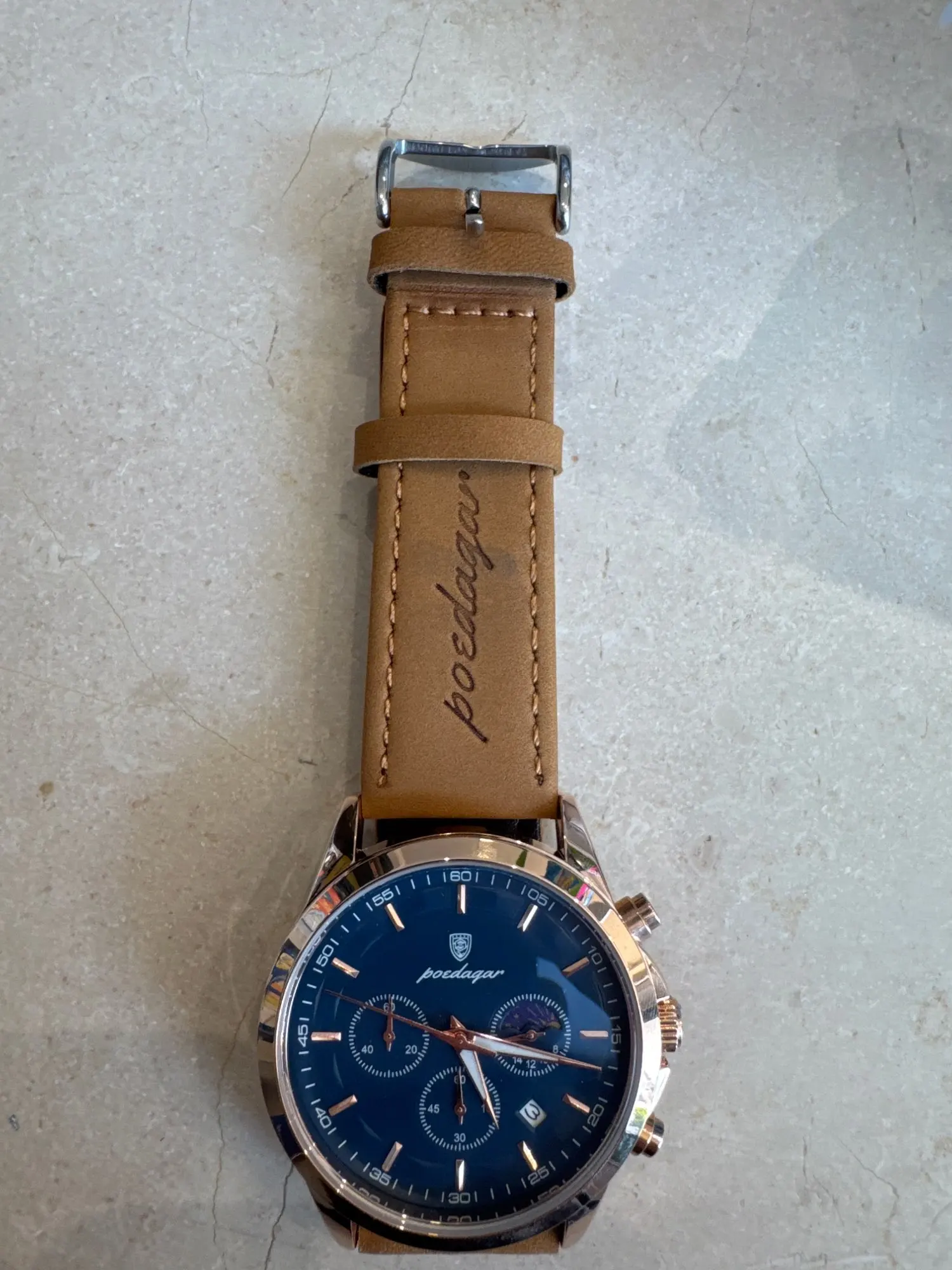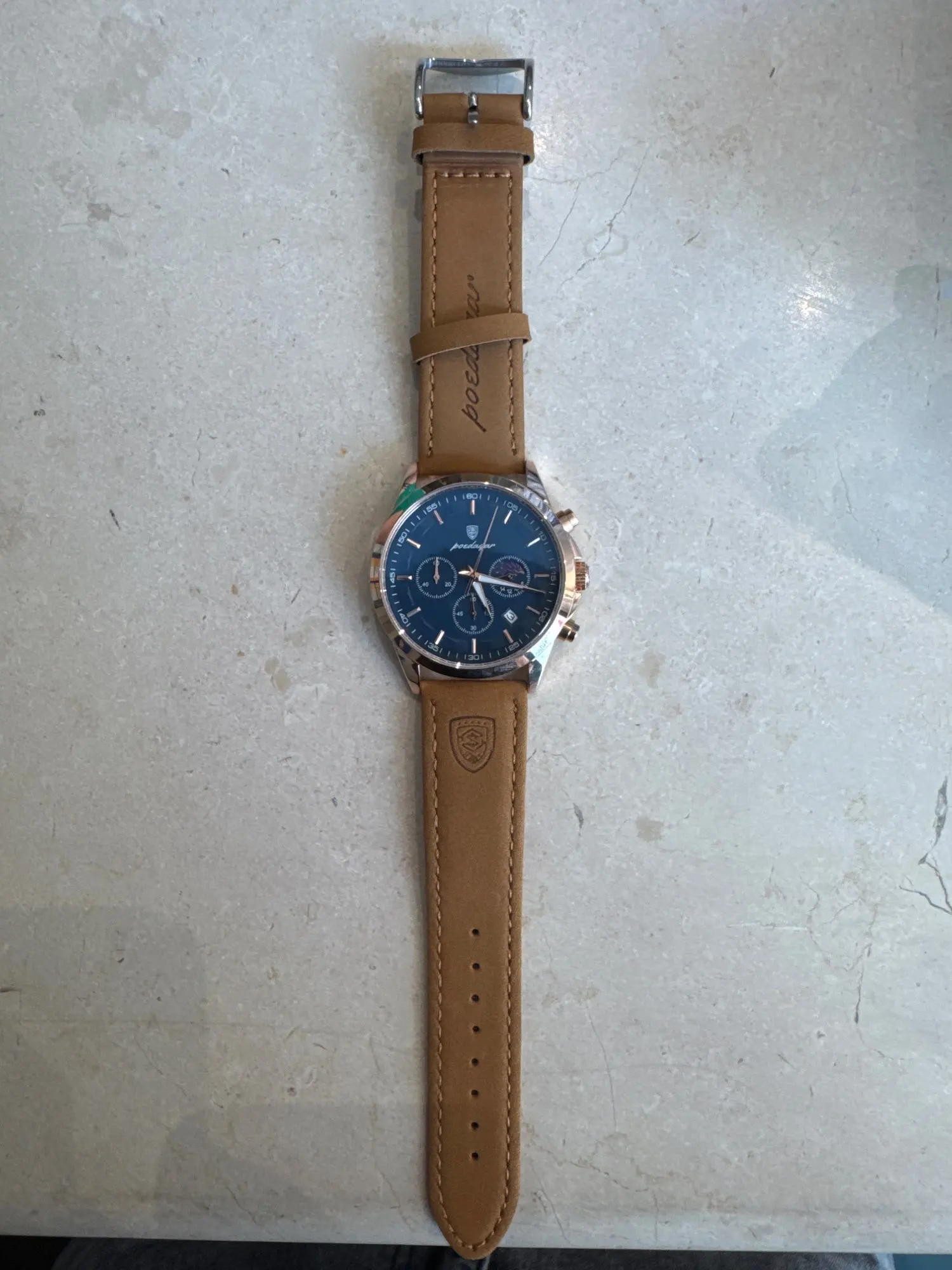 Meticulously designed for the discerning wearer, this chronograph wristwatch blends a sculpted dial with a premium leather strap for a polished, versatile look. A robust stainless steel case houses a sapphire crystal face with luminous hands and precise sub-dials, while quartz movement ensures reliable timekeeping. Water resistance to 3 ATM enables everyday wear and light exposure, complemented by a date window that adds practical appeal.