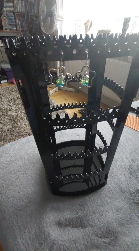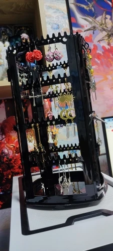 - Organization: Tiered hook rails for earrings, ear clips, and necklaces